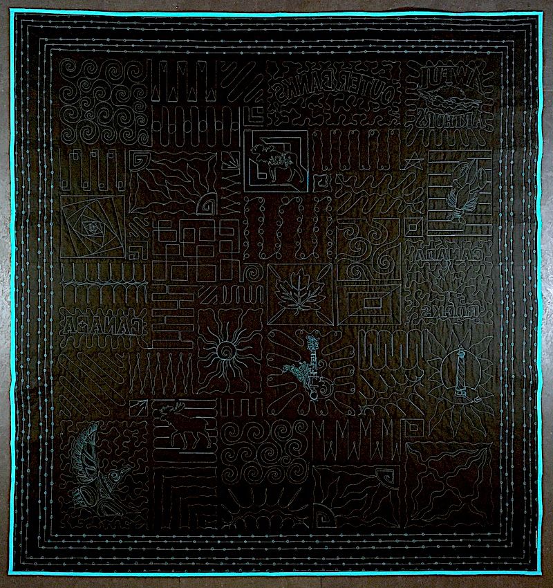 This Stained-glass quilt is made from all black travel T-shirts. The leading is teal. Queen size – 92 x 100. Border: Double 4” solid border.
